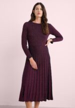 “If confidence had a fabric and a colour, it would be this knitted amethyst masterpiece!” Deze prachtige midi-jurk heeft een aansluitende top met 3/4 mouwen en een midi rok met ‘plooien’. Uitgevoerd in een superzachte, fijngebreide en stretchy viscosemix met een vleugje wol in amethist paars die heerlijk draagt… perfect voor het nieuwe seizoen! * Midi jurk * Ronde halslijn * 3/4 mouwtjes * Geen rits of knopen; aantrekken en ready to go! * Valt bij een lengte van 1,70 m tot halverwege de kuit