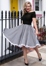 ”A dance of contrasts, where the sophistication of black meets the purity of white, creating a silhouette that’s as timeless as it is daring.” De inspiratie van onze in-house designers dit seizoen was ”Bright Dreams in Neon Lights”. Maar het blijft niet bij dromen want deze collectie is als een droom die ook daadwerkelijk uitkomt! Deze figure hugging dress met uitlopend detail aan de rok is uitgevoerd in een zwart/witte stof met een lichte stretch die je rondingen perfect volgt zonder af te tekenen voor een curvalicious fit. “Elegance, redefined; a perfect fusion of bold contrasts and delicate grace.” * Aansluitend model * Halslijn met kraagdetail * Zwarte biesjes aan de gevoerde, witte top * 3/4 mouwtjes * Afneembare riem voor een extra ‘snatched’ taille * Rok met ‘fishtail’ detail * Blinde rits aan de achterzijde * Gorgeous model en Pin Up Doll next door Greta Gardner is 1,72: haar pumps en accessoires zijn haar eigen treasures