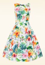 ”Flowers, the ultimate mood-lifter!” Talia is uitgevoerd in een stevige, maar soepel vallende, witte katoenmix met een kleurrijke tropische bloemenprint en voorzien van een lichte stretch voor een heerlijk draagcomfort. * Full swing * Hoge halslijn * Zijwaartse steekzakken * Combineer met een van onze petticoats voor een extra feestelijk effect * Blinde rits aan de zijkant * Valt bij een lengte van 1,70 m over de knie