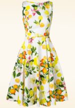 Deze 50s Luisa Lemon Swing Dress in White tovert de zon achter de wolken vandaan! Deze zomerse beauty heeft een elegante boothals, een volle zwierige swing rok waardoor er een super vrouwelijk silhouet ontstaat en handige zijwaartse steekzakken. Uitgevoerd in een stevige maar soepel vallende, witte katoenmix met een lichte stretch en een print van sinaasappels, citroenen en tropische bloemen. Perfect voor het aankomende zonnige seizoen! * Full swing model * Boothals * Zijwaartse steekzakjes * Blinde rits achterzijde * Te combineren met een petticoat voor een extra feestelijk effect * Valt bij een lengte van 1,70 m over de knie
