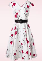 Voel je de allermooiste in deze 50s Serina Flowers Swing Dress in White! De top is voorzien van een elegante V-halslijn, V-rug en speelse kapmouwtjes. Vanaf de taille waaiert ze uit in een full swing rok die zorgt voor een super vrouwelijk silhouet. Uitgevoerd in een stevige maar luchtige, witte katoenmix met een lichte stretch en een prachtige bloemenprint in donkerrood en zwart. ”Mirror, mirror on the wall, who’s the most beautiful of them all?” * Full swing model * V-halslijn * V-rug * Kapmouwtjes * Afneembare stoffen riem * Zijwaartse steekzakken * Combineer met een van onze petticoats voor een extra feestelijk effect * Blinde rits achterzijde * Valt bij een lengte van 1,70 m over de knie