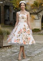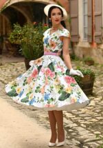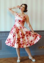 “Floral dreams in motion.” Deze prachtige swingjurk is gemaakt van een stevige, maar soepelvallende ivoorwitte katoenmix, versierd met een schitterende bloemenprint in blush en koraaltinten. Dankzij de lichte stretch draagt ze heerlijk comfortabel en beweegt de zwierige rok elegant mee bij elke stap, een echte must-have voor een speelse, zomerse look. * Full swing * Zijwaartse steekzakken * Blinde rits achterzijde * Combineer met een van onze petticoats voor een extra feestelijk effect * Valt bij een lengte van 1,70 m over de knie