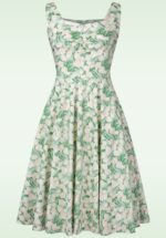 ”Dreamy spring vibes!” Lucy maakt je helemaal klaar voor de lente! Ze heeft een subtiele sweetheart halslijn met speelse plooitjes en loopt uit in een volle swing rok, waardoor ze je een prachtig silhouet geeft. Ze is uitgevoerd in een stevige, maar soepel vallende mintgroene katoenmix met een elegante bloemenprint in pasteltinten en een lichte stretch voor een heerlijk draagcomfort. * Full swing * Sweetheart halslijn * Plooitjes bij de buste * Zijwaartse steekzakken * Combineer met een van onze petticoats voor een extra feestelijk effect * Blinde rits achterzijde * Valt bij een lengte van 1,70 m over de knie