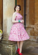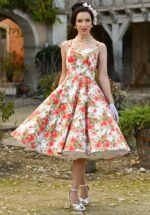 “My time to bloom!” De Gorgeous Scarlet Garden is buitengewoon elegant met haar hoge halslijn, vaste strikbandjes, korte mouwtjes en een volle, flowy swing rok. Ze is gemaakt van een stevige maar soepel vallende rode katoenmix met een kleurige bloemenprint, en heeft een lichte stretch voor ultiem draagcomfort. * Full swing * Hoge halslijn met vaste strikbandjes * Zijwaartse steekzakken * Blinde rits aan de achterzijde * Combineer met een van onze petticoats voor een extra feestelijk effect * Valt bij een lengte van 1,70 m over de knie