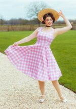 “Gingham dreams and sunny schemes.” De aansluitende top heeft een subtiele, elegante sweetheart halslijn en brede schouderbanden voor een mooi gebalanceerd silhouet. Vanaf de taille loopt de jurk uit in een klassieke full swing rok met het iconische hourglass-effect en een heerlijke zwier bij elke stap. Gemaakt van een stevige maar soepel vallende katoenmix, met een speelse gingham print in wit en roze en een lichte stretch voor extra draagcomfort. * Full swing * Subtiele sweetheart halslijn * Zijwaartse steekzakken * Blinde rits achterzijde * Combineer met een van onze petticoats voor een extra feestelijk effect * Valt bij een lengte van 1,70 m over de knie