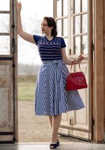 ”More stripes please!” Suzie is speels en wordt hoog in de taille gedragen vanwaar ze uitloopt in een zwierige swing rok waardoor er een super vrouwelijk silhouet ontstaat. Uitgevoerd in een stevige maar soepele, katoenmix (lichte stretch) voorzien van een streepjesprint in navy en wit. * Swing stijl * Zijwaartse steekzakken * Afneembare matching sash voor een extra ‘snatched’ taille * Blinde rits aan de zijkant * Kan gecombineerd worden met een van onze petticoats * Valt bij een lengte van 1,70 m over de knie * @lovisladouce is 1,72 m * Let op; de kleur van het product op de video kan afwijken van de daadwerkelijke kleur van het product