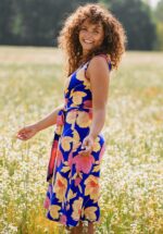 “It’s going to be a sweet summer!” Zet de bloemetjes buiten in deze Milly jurk! Deze frisse en vrolijke jurk heeft een vaste overslagtop, afgewerkt met een speels ric-rac randje en een matching striklint, en loopt uit in een zwierig A-lijntje. Ze is uitgevoerd in een dunne, soepele EcoVero viscosemix in blauw, voorzien van een kleurrijke en lieflijke bloemenprint. * A-lijn * Vaste overslag * Geen rits of knopen * Afneembaar striklint, voor een extra ‘snatched’ taille * Valt bij een lengte van 1.70 m net over de knie