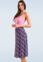 “Floral, free, and effortlessly you.” Deze kleurrijke beauty heeft een flatterende A-lijn en een elastische tailleband die samen zorgen voor een moeiteloze, comfortabele fit. Ze is uitgevoerd in een soepele en stretchy, blauwe EcoVero viscosemix met een bloemenprint in roze- en groentinten. * A-lijn * Elastische tailleband * Geen rits of knopen * Valt bij een lengte van 1,70 m halverwege de kuit