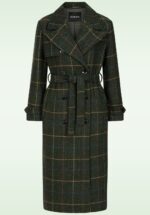 “Structured herringbone, check-print charm… trenchcoat style redefined.” Deze lange jas in trenchcoat stijl is uitgevoerd in een zware kwaliteit, kakigroene stofmix met wol (stretcht niet!), voorzien van een visgraatmotief en ruitjes in geel, blauw, bruin en zwart. Bovendien is ze volledig gevoerd met een satijnachtig stofje voor extra draagcomfort. * Trenchcoat stijl * Puntige reverskraag * Gevoerd * It has pockets! * Afneembare strikband voor een extra ‘snatched’ taille * Dubbele knopenreeks * Split achterzijde * Valt bij een lengte van 1,70 m over de knie