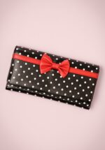 Deze Carla Bow Polka Purse is een speelse portemonnee met een prachtige strik. Polkadots en strikjes… een betere combinatie bestaat er niet, toch? Deze stevige en ruime portemonnee is gemaakt van een mooie kwaliteit zwart ‘faux’ leder met witte polkadots en een eyecatching rode strik met bies aan de voorzijde. Jouw centjes voelen zich beslist thuis in deze fabulous portemonnee! 😉 * Goudkleurige sluiting * Extra verdeelvak met ritssluiting * Ruimte voor 12 pasjes en pasfoto’s * 2 open ruimtes voor bonnen en briefgeld * Gevoerd in zwart ‘faux’ leder