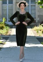 “Wrapped in velvet, dripping in confidence.” Curve hugging Carmen is uitgevoerd in een stevige, maar soepele en zachte donkergroene stof met een fijne stretch in de luxe look and feel van fluweel. * Pencil model * Subtiele sweetheart halslijn * Lange, licht poffende mouwen * Blinde rits achterzijde * Split achterzijde * Valt bij een lengte van 1,70 m over de knie