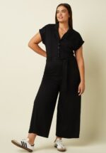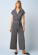 ”Jump for joy” in deze GE-WEL-DIGE jumpsuit. Uitgevoerd in een soepele, stretchy Ecovero viscosemix met een print in donkerblauw, groen en wit die heerlijk draagt. * Jumpsuit * Reverskraagje * Knopenreeks * Korte mouwtjes met vaste omslagjes * Vaste strikbanden * Zijwaartse steekzakken * Wijde pijpen (cropped)
