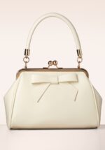 ”Just a daydream away!” Dit kleine zusje van de klassieke American Vintage bag heeft een opvallende goudkleurige metalen klipsluiting voor een echte vintage look en is uitgevoerd in crèmekleurig mat imitatie leder afgewerkt met een schattige strik. * Small sized * Klipsluiting * Binnenvak met 3 extra vakjes, waarvan 1 met rits * Afneembaar hengsel * Kan crossbody gedragen worden * Volledig gevoerd * Groot genoeg voor je telefoon, sleutels, en een kleine portemonnee