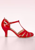 ‘In the dance of life, always move to your own music!’ Opengewerkte pumps met een T-strap bandje, uitgevoerd in imitatie roze lakleder met een parelmoer finish. * Pumps * T-strap * Verstelbaar bandje * Goudkleurig gespje * Elegant, hoog hakje * Comfy binnenzool * Anti-slip zool