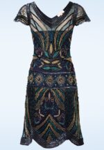 âRoaring â20s vibes, modern sparkle… flapper fabulous in every step.â Deze hand bewerkte, party-proof jurk is een reproductie van de elegante flapper dresses uit de jaren 20! Uitgevoerd in een donkerblauwe, semi-doorschijnende stof met een donkerblauwe onderjurk, voorzien van een hele lichte stretch. Afgewerkt met glimmende kraaltjes, pailetten en studs in blauw, zwart en goudtinten. âDazzle, sparkle, repeat!â  * Aansluitend model * Handbewerkt * Onderjurkje * V-hals en rug * Geschulpte kapmouwtjes * Geen rits of knopen; aantrekken en ready to party! * Valt bij een lengte van 1,70 m net over de knie