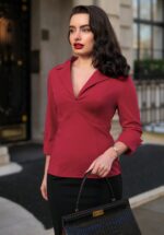 Dianne Travel blouse in wijnrood”Act like a lady, think like a boss!” Ook dit seizoen hebben onze getalenteerde in-house designers zich laten inspireren door draagbare en klassieke silhouetten met een White Collar Edge; items voor de power vrouw die de zakenwereld omver blaast met haar hyper vrouwelijke silhouet. Deze licht getailleerde classy blouse heeft het comfort van een top en is uitgevoerd in een stevige en soepele wijnrode travel stof met een fijne stretch, waardoor ze heerlijk comfortabel draagt! ”Stay classy and comfy!” * Licht getailleerd * Puntig revers kraagje * 3/4 mouwtjes met puntige omslagjes * Blinde rits achterzijde * Lang genoeg om op een normale heupbroek te dragen