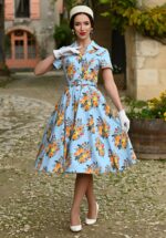 ”Spring is in the air!” Vier de lente in gorgeous Hallie! Ze is voorzien van een revers kraagje met decoratieve knopen aan de voorzijde, korte mouwtjes en loopt uit in een full swing rok met handige steekzakken. Ze is uitgevoerd in een stevige, maar soepel vallende, licht blauwe katoenmix (licht stretchy) met een bloemenprint in verschillende groen en oranjetinten, die heerlijk comfy draagt! * Full swing * Revers kraag * Decoratieve knopen voorzijde * Zijwaartse steekzakken * Combineer met een van onze petticoats voor een extra feestelijk effect * Blinde rits aan de zijnaad * Valt bij een lengte van 1,70 m over de knie * Let op; de kleur van het product op video kan afwijken van de daadwerkelijke kleur van het product