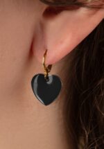 Wij zijn helemaal verliefd op deze oorbelletjes! Lichtgewicht en uitgevoerd met een verguld messing haakje waaraan een hartvormig geëmailleerd hangertje in zwart hangt. * Hangertjes * Vergulde messing leverback sluiting * Emaille * Koper * Verkleuren en vlekken niet * Nikkelvrij (anti-allergeen)