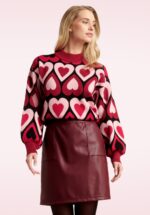 ”I simply LOVE sweater season!” Ze is uitgevoerd in een zachte, warme, fijngebreide viscosemix in zwart met een fantastisch hartpatroon in rode en roze tinten. ”Am I wearing a bra? Who knows. Am I wearing what I wore to bed under it? Maybe.” * Oversized * Lange ballonmouwen * Stretchy ribboord * Lang genoeg om op een normale heupbroek te dragen * Let op; de kleur van het product op de video kan afwijken van de daadwerkelijke kleur van het product