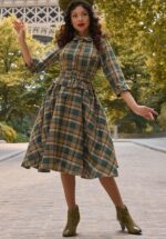 “Nostalgic charm meets modern ease.” Omarm de cozy charme van de herfst met Helioise Gia! Ze heeft een flatterende swingrok en een lief Peter Pan-kraagje die een subtiele vintage touch geven aan een moderne, verfijnde pasvorm. Functionele knoopjes aan de voorkant en een onopvallende rits aan de achterkant zorgen voor een perfecte fit. En ja, handige zakken maken haar net zo praktisch als stijlvol. Ze is uitgevoerd in een stevige maar soepele 100% katoen met een tartanruit in verschillende groentinten en een accent van roze. * Swing jurk * Peter Pan kraag * 3/4 mouwen met vaste omslagjes * Functionele knopenreeks voorzijde * Verborgen ritssluiting achterzijde * Peplum detail * Afneembare riem, voor een extra ‘snatched’ taille * Voorzien van zakken * Valt bij een lengte van 1,70 m over de knie