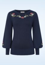 “Navy elegance meets floral charm!” Deze marineblauwe trui is een herfstfavoriet met een hoge halslijn en lange, volumineuze pofmouwen. Subtiele geborduurde bloemen op de halslijn en mouwen geven een verfijnde, vrouwelijke touch. Uitgevoerd in een zachte viscosemix die heerlijk comfortabel draagt en eenvoudig te combineren is met elke outfit. * Ronde halslijn * Lange pofmouwen * Stretchy ribboorden * Lang genoeg om op een normale heupbroek te dragen