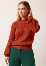 Deze top is onmisbaar in je garderobe! Ze heeft een hoge halslijn, lange pofmouwen en is uitgevoerd in een fijn gebreide, zachte, soepele en stretchy roestbruine acrylmix met een vleugje alpaca /wol, afgewerkt met een klassiek opengewerkt patroon. Dit schatje is een echte must-have voor het komende seizoen! * Hoge halslijn * Lange pofmouwen * Opengewerkt patroon * Stretchy ribboord * Lang genoeg om op een normale heupbroek te dragen