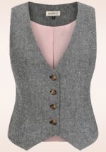 “Proof that grey can steal the show!” Josie is een echte aanwinst voor je garderobe! Dit mouwloze giletje heeft een classy business uitstraling, en kan prima als single statement piece gedragen worden! Ze is uitgevoerd in een stevige maar toch soepele, met sateen gevoerde stofmix voorzien van een vleugje wol (stretcht niet!) in een prachtige gemêleerde grijze tint. * Gilet * Mouwloos * V-hals * Knoopsluiting * Decoratief riemdetail achterzijde * Gevoerd in zachtroze sateen