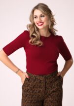 Kim wil je iedere dag wel dragen! Dit veelzijdige en klassieke truitje heeft een hoge ronde halslijn, korte pofmouwtjes en is uitgevoerd in een heerlijke soepele en stretchy, bordeauxrode viscosemix die heerlijk comfortabel draagt. * Korte pofmouwen * Stretchy ribboord * Lang genoeg om op een normale heupbroek te dragen * Let op; de kleur van het product op de video kan afwijken van de daadwerkelijke kleur van het product