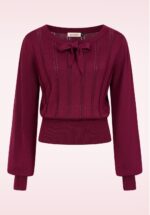 “Volume in the sleeves. Power in the pattern. And a bow to top it off!” De top heeft een ronde halslijn met een speelse strik en lange pofmouwen. Uitgevoerd in een heerlijk soepele, stretchy, fijngebreide bordeauxrode viscosemix met een klassiek opengewerkt patroon. * Vaste strik * Lange pofmouwen * Stretchy ribboorden * Lang genoeg om op een normale heupbroek te dragen