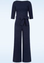 “Power dressed in glitter!” Irina heeft een elegante boothals, 3/4-mouwen en lange, wijde broekspijpen. Ze is uitgevoerd in een stevige maar soepel vallende, stretchy crêpe-achtige marineblauwe stof, bezaaid met fonkelende glitters die heerlijk comfortabel draagt. * 3/4 mouwen * Boothals * Afneembaar striklint in de taille * Blinde rits achterzijde * Lange, wijde pijpen