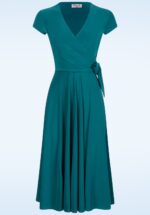 Deze Layla overslag jurk in teal is een echte vintage beauty die geschikt is voor iedere gelegenheid! De aansluitende top heeft een prachtige V-halslijn, mooie overslag, speelse strikbandjes die je zowel los als gestrikt kunt dragen en flatterende plooitjes in de zij. Vanaf de taille waaiert ze uit in een zwierige semi-swing rok. Ze is uitgevoerd in een glad en soepel, licht glanzend, stretchy teal gekleurd stofje. “Layla we’re in love!” * Semi-swing stijl * Vaste gevoerde overslag * Korte kapmouwtjes * Vaste strikbandjes * Geen rits of knopen; aantrekken en ready to go * Valt over de knie bij een lengte van 1,70 m