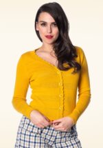 De Little Luxury Cropped Cardigan is een echte klassieker! Classy in al haar eenvoud en daardoor DE perfecte match met al jouw vintage kledingstukken! Deze korte cardi heeft een elegante V-halslijn en licht poffende lange mouwen die iets loose-fit vallen. Uitgevoerd in een fijngebreide mosterdgele viscosemix met een heerlijke stretch voor een mooie aansluitende pasvorm. De combinatiemogelijkheden zijn eindeloos! * V-halslijn * Lange mouwen * Reeks knopen * Stretchy ribboord langs de mouwen en onderkant * Korter stijltje