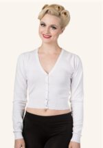 De Little Luxury Cardigan is een echte klassieker! Classy in al haar eenvoud en daardoor DE perfecte match met al jouw vintage kledingstukken! Deze cardi heeft een elegante V-halslijn en licht poffende lange mouwen die iets loose-fit vallen. Uitgevoerd in een fijngebreide witte viscosemix met een heerlijke stretch voor een mooie aansluitende pasvorm. De combinatiemogelijkheden zijn eindeloos! * V-halslijn * Lange mouwen * Reeks knopen * Stretchy ribboord langs de mouwen en onderkant