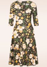 “Wearing this floral dress is like being hugged by a garden, minus the thorns!” 😉 Uitgevoerd in een soepele en stretchy, zwarte katoenmix voorzien van een oogverblindende bloemenprint in geeltinten en een vleugje blauw die heerlijk draagt. * Swing jurk * Puntig kraagje * Voorzien van 3 decoratieve knopen * 3/4 mouwen * Voorzien van zakken! * Blinde ritssluiting aan de zijkant * Te combineren met een petticoat voor een extra feestelijk effect * Valt bij een lengte van 1,70 m over de knie