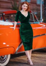 ”As glam as it gets!” Jij zult een verpletterende indruk maken in deze Marilyn Velvet Pencil Dress in Green! De inspiratie van onze in-house designers dit seizoen was ”Transcending Classic Glamour”. En eerlijk is eerlijk: Al onze verwachtingen zijn alweer overtroffen met deze collectie! Uitgevoerd in een iets dikkere, maar soepele en zachte, stretchy donkergroene stof met de look and feel van luxe velvet voor een perfect fit! ”Life’s short, wear glamour!”. * Pencil stijl * Brede V- halslijn * Gedrapeerde plooitjes bij de buste * 1/2 mouwtjes die off-shoulder gedragen kunnen worden * Corrigerende bengaline shapewear van onder de buste tot over de heup * Gevoerd * Let op: Deze dress heeft géén rits; dus instappen i.p.v. over je hoofd aantrekken en wiggle wiggle 😉 * Gorgeous model en Pin Up Doll next door Greta Gardner is 1,72 m: haar pumps en accessoires zijn haar eigen treasures