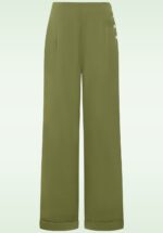 “High waist, bold moves.” Deze Ottavia pantalon in olijfgroen combineert een elegante hoge taille met functionele knopen aan de zijkant en wijde pijpen met vaste omslagjes voor een vloeiende, retro-geïnspireerde look. De zachte, soepel vallende stofmix laat je silhouet prachtig uitkomen en geeft je outfit een tijdloze vintage touch. * Hoge taille * Functionele knopen aan de zijkant * Wijde pijpen met vaste omslag