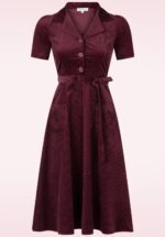 Voeg wat ‘fourties flair’ toe aan je garderobe! Ze heeft een V-halslijn met een speels reverskraagje, korte pofmouwen en een reeks grote knopen. Het striklint accentueert je taille voor een supervrouwelijk silhouet. Uitgevoerd in stevig maar soepel en zacht ribfluwelen katoen (stretcht niet) in granaatappelrood, dat heerlijk draagt. Slaat jouw vintagehartje ook al op hol? 😉 * Semi-swing model * V-halslijn * Revers kraagje * Korte pofmouwen * Reeks knopen voorzijde * Afneembaar striklint * Zakken voorzijde * Blinde rits zijkant * Valt bij een lengte van 1,70 m over de knie