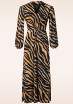 ”Pop some colour!” Deze pracht van een jurk is uitgevoerd in een soepele en stretchy, gladde slinky stof met kleurrijke animal stripes in blauw, geel en bruin, voorzien van een StayFresh coating. * Maxi jurk * V-hals * Lange mouwen met elastiek * Gevoerd tot over de heupen * Knoopdetail in de taille * Geen rits of knopen; aantrekken en ready to go! * Split aan de voorzijde * Valt bij een lengte van 1,70 m tot boven de enkel