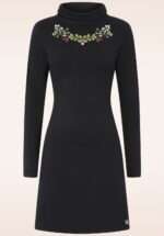 “The little black dress, reimagined with a flourish of flowers.” Dit A-lijn stijltje heeft een colkraagje en lange mouwen. Uitgevoerd in een super comfortabele en stretchy, zwarte bio katoenmix met prachtige, geborduurde bloemetjes bij de hals. * A-lijn * Colkraagje * Lange mouwen * Geen rits of knopen; aantrekken en ready to go! * Valt bij een lengte van 1,70 m net op de knie