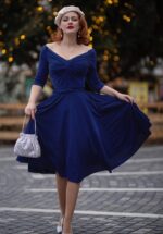 ”Evening blue like a twilight wish!” De inspiratie van onze in-house designers dit seizoen was ”Bright Dreams in Neon Lights”. Maar het blijft niet bij dromen want deze collectie is als een droom die ook daadwerkelijk uitkomt! Deze classy swing beauty beweegt gracieus met je mee als je de sterren van de hemel danst. Ze is voorzien van corrigerende bengaline shapewear en is uitgevoerd in een zware, iets dikkere, stretchy glitterstof in avondblauw voor een spotlight waardige fit. ”Pure starlight in motion!” * Swing model * V-hals met knoopdetail * 1/2 mouwen die ietwat off-shoulder vallen * Afneembare riem, voor een extra ‘snatched’ taille * Volledig gevoerd (corrigerende bengaline shapewear) * Blinde rits in de zijnaad * Gorgeous model en Pin Up Doll next door Greta Gardner is 1,72: haar pumps en accessoires zijn haar eigen treasures
