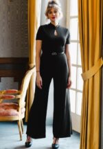 “Elegance with an atomic twist.” Deze jumpsuit heeft korte mouwen, een hoge halslijn met opstaand kraagje en een keyhole-detail met een decoratief knoopje aan de voorzijde. Lange, wijde pijpen maken het silhouet elegant en tijdloos. Ze is uitgevoerd in een soepelvallende, stretchy stofmix die heerlijk draagt en is afgewerkt met een blinde ritssluiting aan de achterzijde, zodat je haar gemakkelijk aan- en uittrekt. * Jumpsuit * Korte mouwen * Hoge halslijn met opstaand kraagje * Keyhole detail met decoratief knoopje voorzijde * Blinde rits achterzijde * Lange, wijde pijpen * Melissa is 1,78 m * Exclusief bij Topvintage verkrijgbaar * Let op; de kleur van het product op de video kan afwijken van de daadwerkelijke kleur van het product