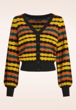 “Wearing my cardi like a party… balloon sleeves, bold stripes and big vibes!” Ze heeft een v-halslijn, knoopjes aan de voorzijde, lange pofmouwens en is uitgevoerd in een fijngebreide, soepele en stretchy katoen/viscosemix in zwart, met een kleurrijk streepjes patroon. * V-halslijn * Lange pofmouwen * Knopenreeks * Stretchy ribboorden * Lang genoeg om op een normale heupbroek te dragen