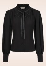 “A little bow goes a long way!” Deze prachtige zwarte blouse is een echte eyecatcher! Ze heeft een klein opstaand roezelkraagje met vaste strikbandjes, lange pofmouwen met elegante manchetten en glanzende knoopjes die een subtiel speels accent geven. Uitgevoerd in een soepel vallende stof die heerlijk draagt en moeiteloos combineert met rokken, pantalons of jeans voor een vrouwelijke en verfijnde look. * Klein opstaand roezelkraagje met vaste strikbandjes * Lange pofmouwen met manchetten * Knopenrij * Lang genoeg om op een normale heupbroek te dragen