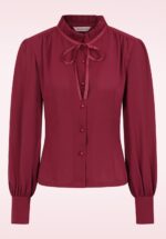 “A little bow goes a long way!” Deze prachtige bordeauxrode blouse is een echte eyecatcher! Ze heeft een klein opstaand roezelkraagje met vaste strikbandjes, lange pofmouwen met elegante manchetten en glanzende knoopjes die een subtiel speels accent geven. Uitgevoerd in een soepel vallende stof die heerlijk draagt en moeiteloos combineert met rokken, pantalons of jeans voor een vrouwelijke en verfijnde look. * Klein opstaand roezelkraagje met vaste strikbandjes * Lange pofmouwen met manchetten * Knopenrij * Lang genoeg om op een normale heupbroek te dragen