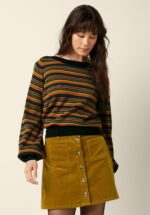 “Audrey and you will be so happy together! ;-)” Deze beauty heeft een elegante boothals, lange bisschopsmouwen en strepen aan de voorzijde in retro seventies kleuren. Ze is uitgevoerd in een zachte en stretchy, zwarte EcoVero viscose, welke een milieuvriendelijkere variant is en onder betere en veiligere arbeidsomstandigheden geproduceerd wordt. * Boothals * Lange bisschopsmouwen * Stretchy ribboorden * Lang genoeg om op een normale heupbroek te dragen