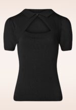 Deze 50s Belle Bow Pointelle Top in Black is er eentje om verliefd op te worden! De top heeft een mooie ronde halslijn met een speelse strik en 3/4 mouwtjes, cute! Uitgevoerd in een heerlijk soepele, stretchy, fijngebreide, zwarte viscosemix met een klassiek opengewerkt patroon. Een veelzijdige top die niet mag ontbreken in de kast van een echte vintage lady! * Ronde halslijn * Vaste strik * 3/4 mouwtjes * Stretchy ribboorden * Lang genoeg om op een normale heupbroek te dragen
