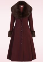 ”Graceful winter times!” Deze classy mantel is niet alleen prachtig om te zien, maar ze houdt je ook nog eens heerlijk warm! Uitgevoerd in een luxueuze, ietwat dikkere, zachte bordeauxrode stof (stretcht niet) die volledig is gevoerd voor extra comfort. * Semi-swing model * Knopenrij * Geheel gevoerd * Afneembare kraag van chocoladebruin imitatiebont * Lange mouwen * Afneembare manchetten van chocoladebruin imitatiebont * Zijwaartse steekzakken * Knoopdetails aan de achterzijde * Valt ruim over de knie bij een lengte van 1,70 m