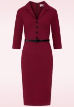 “Classic, with a modern twist.” Maak indruk in deze verfijnde jurk! Ze heeft een strakke, flatterende pasvorm, 3/4-mouwen en een klassieke reverskraag. De decoratieve knoopjes aan de voorzijde geven een subtiel speels accent, terwijl de afneembare lakriem je taille elegant benadrukt. Uitgevoerd in een stevige, maar stretchy bengaline-achtige stof in wijnrood die heerlijk draagt en perfect valt. * Pencil model * Revers kraagje * Sierknopen * 3/4 mouwen * Afneembaar lakriempje, voor een extra ‘snatched’ taille * Blinde rits achterzijde * Valt bij een lengte van 1,70 m net over de knie