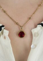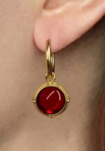 Cute and timeless! Deze oorbelletjes zijn uitgevoerd in verguld stainless steel met een hangertje voorzien van een robijnrode, bolle, glazen steen. * Ringetjes met kliksluiting * Glazen hanger * Verguld stainless steel * Verkleuren en vlekken niet * Nikkelvrij (anti-allergeen)
