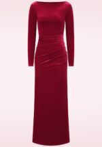 ”Draped in deep red velvet, she carried a story of grace and fire.” Deze beauty heeft een elegante boothals, lange mouwen, plooien in de taille die super flatterend werken en een prachtige uitlopende maxi rok. Uitgevoerd in een soepele en stretchy, dieprode stof met de look and feel van luxe fluweel. * Maxi jurk * Boothals * Gevoerde top * Lange mouwen * Flatterende plooien in de taille * Blinde rits achterzijde * Uitlopende maxi rok * Reikt bij een lengte van 1,70 m tot aan de enkel